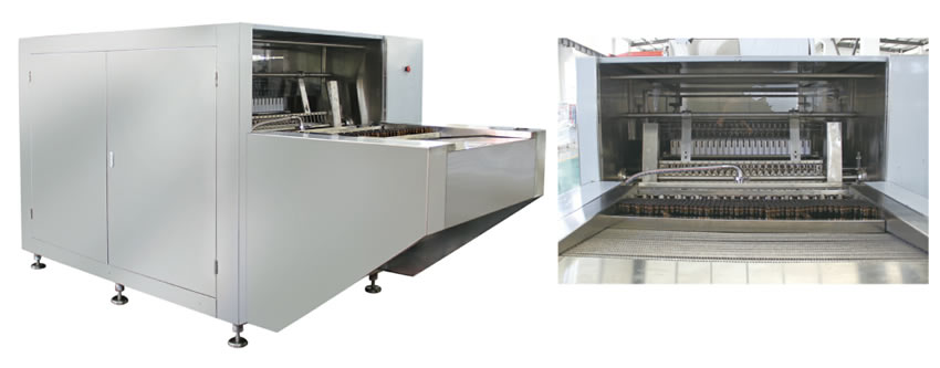 整(zhěng)機(jī)采用PLC控製,人機界麵操作,具有手動、自動切換(huàn)功能。先經超聲波粗洗,後(hòu)由(yóu)特製瓶鬥載瓶,經十一道水氣工位交(jiāo)替內外壓力衝洗,最後經平(píng)移卸料機構出瓶,轉入下道工序。
