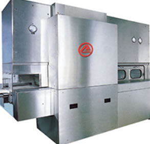 整機(jī)與瓶接觸(chù)部分均用不鏽鋼製造。隧道中輸瓶網帶采用日本三菱變頻調速。整機PLC控(kòng)製,觸摸屏全(quán)過程動態監視,熱風循環溫度自動控製(zhì)並記錄,操(cāo)作方便。