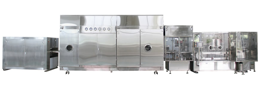 本機組符合“cGMP”要(yào)求(qiú),適用(yòng)於西林瓶的洗瓶、烘幹滅菌及粉劑分裝,由LXP型鏈式(shì)多功位清洗機、KSM型玻璃瓶隧道式(shì)滅菌幹燥機及QFZ型氣流式粉劑分裝機組成。