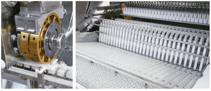 清(qīng)洗采用先進(jìn)的特製瓶鬥(dòu)載瓶,模塊化清洗,十一道水氣交替衝洗,機(jī)械式推出瓶;幹燥滅(miè)菌采用熱風循環,獨有的熱膨脹(zhàng)連接,水冷循環冷卻;粉劑分裝采用(yòng)獨特的不(bú)鏽鋼帶傳送,先進的氣流(liú)微孔活塞頭吸料與分(fèn)裝,獨有的(de)在線計量調節(jiē)及(jí)在線稱重,機械手上塞,無(wú)菌加(jiā)粉(fěn)及無菌加塞等先進工序。