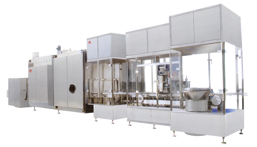 本機組符合“cGMP”要求,適用於(yú)西林瓶的洗瓶(píng)、烘幹滅菌及粉劑分裝,由LXP型鏈式(shì)多功位(wèi)清洗機、KSM型玻璃瓶隧道式滅菌幹燥機(jī)及QFZ型氣流式粉劑分裝機組成。